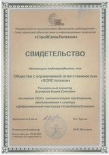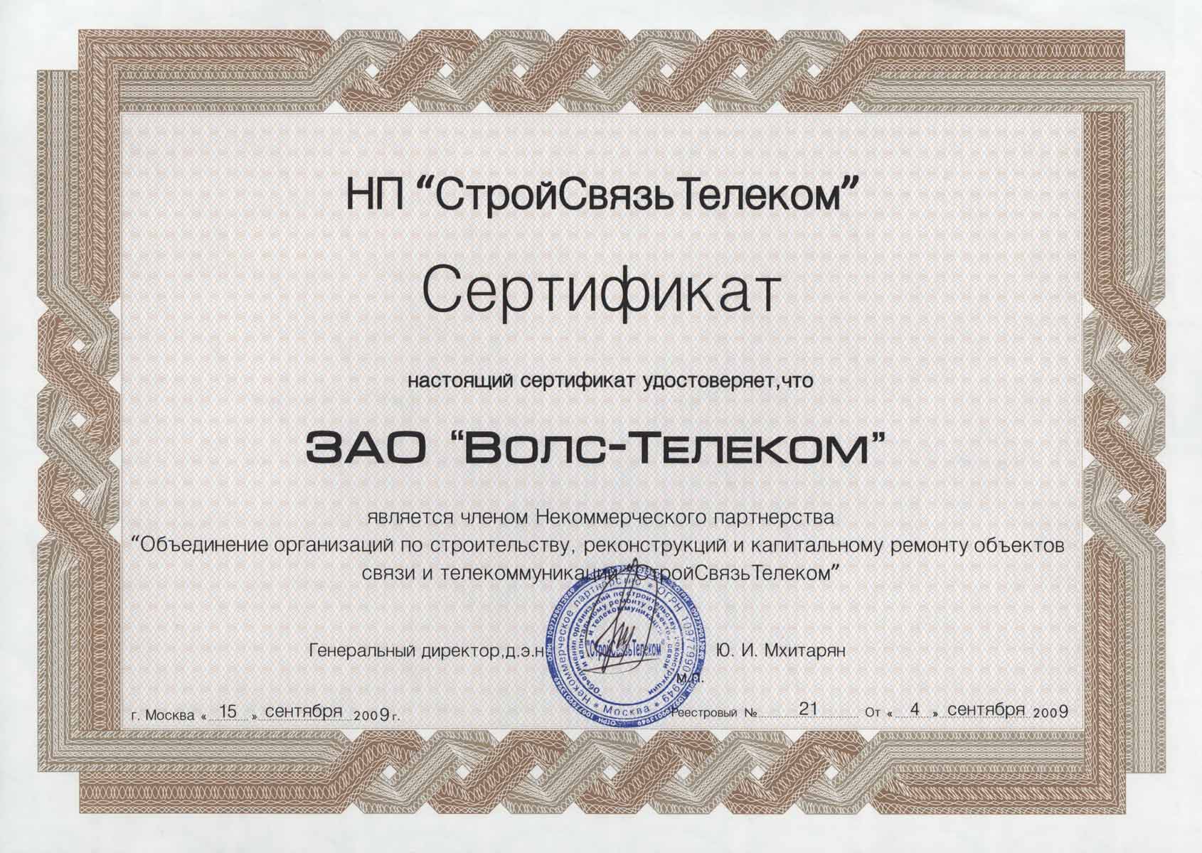 Удостоверение члена НП "Объединение организаций по строительству, реконструкции и капитальному ремонту объектов связи и телекоммуникаций "СтройСвязьТелеком"".