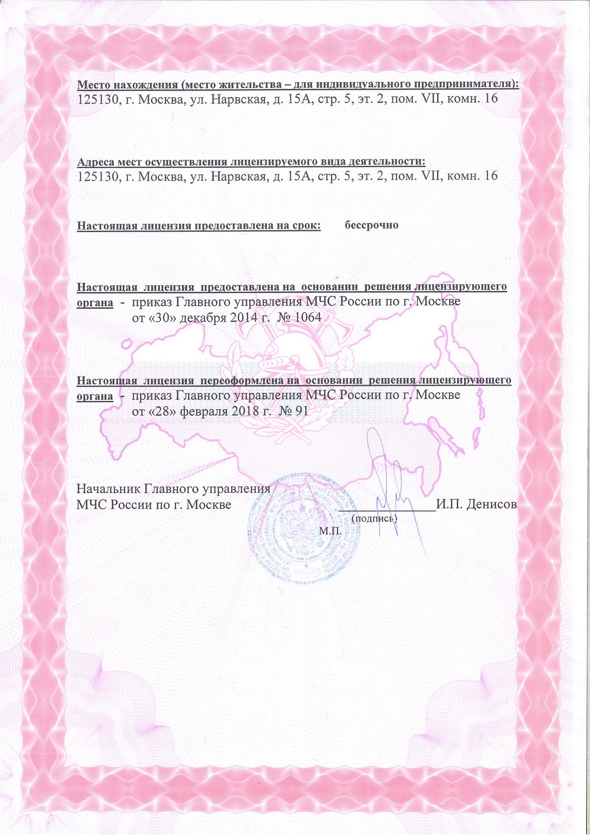 Лицензия МЧС РФ № 77-Б/01578 от 30.12.2014 г. " Выполнение работ по огнезащите материалов, изделий и конструкций".